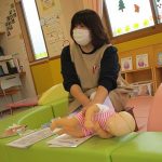 だんだん寒くなってくるこの時期は、低温、低湿度を好むウィルスにとって最適な環境。寒さのため体温が低くなり免疫力が低下し、感染症にかかりやすくなると清水看護師。“発熱した時は熱が出し切るまで冷やさないで”“嘔吐した時は機嫌が良さそうだからといってすぐに食べさせないで、ゆっくり寝かせてあげた後に、スプーン1杯くらいの水分から…そして徐々に消化の良い物を食べさせてあげて”など丁寧にアドバイスを受けました。また、薬の飲ませ方や座薬の使い方、嘔吐や下痢をした時の消毒方法や鼻汁が出た時鼻の下が赤く痛くならない拭き方など、特に月齢の低い子どもを持つママ達にとっては参考になる話ばかりでした。
