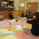 赤ちゃんの便秘解消や快眠を助ける効用があるだけでなく、赤ちゃんにもママにもリラックス効果をもたらしてくれるのがベビーマッサージ。♪○○ちゃんのアンヨ、○○ちゃんのアンヨのマッサージ♪と優しい歌声とまなざしで。そしてあたたかな手の温もりを感じながらのマッサージは、支援センター内をホンワカとした雰囲気を運んでくれました。気持ちよさそうに声を出す子“ママの抱っこが一番!”と言わんばかりに甘えた声で泣き出す子。そんな愛しいわが子の顔をのぞき込みながらマッサージをしていくママの表情は、例えようのない柔らかさが感じられ、傍で見ている私達の心をあたたかく包み込んでくれるように感じたひとときでした。