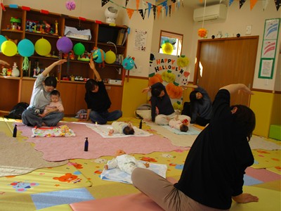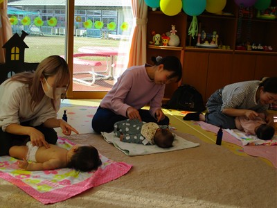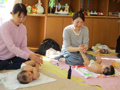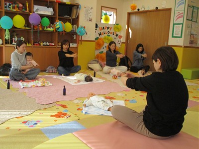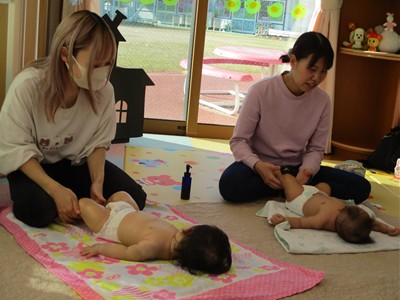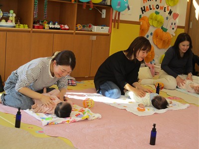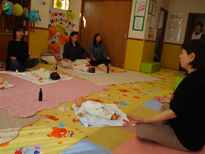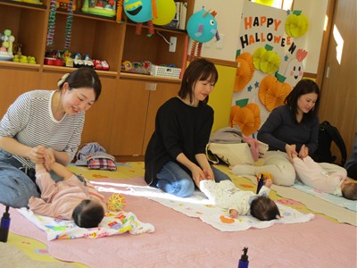 10月30日(木)午後のあたたかな日差しが支援センター内にふりそそぐ中、岡本佳子保育教諭による「ベビーマッサージ」を開催しました。