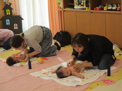 赤ちゃんの便秘解消や快眠を助ける効用があるだけでなく、赤ちゃんにもママにもリラックス効果をもたらしてくれるのがベビーマッサージ。♪○○ちゃんのアンヨ、○○ちゃんのアンヨのマッサージ♪と優しい歌声とまなざしで。そしてあたたかな手の温もりを感じながらのマッサージは、支援センター内をホンワカとした雰囲気を運んでくれました。気持ちよさそうに声を出す子“ママの抱っこが一番!”と言わんばかりに甘えた声で泣き出す子。そんな愛しいわが子の顔をのぞき込みながらマッサージをしていくママの表情は、例えようのない柔らかさが感じられ、傍で見ている私達の心をあたたかく包み込んでくれるように感じたひとときでした。
