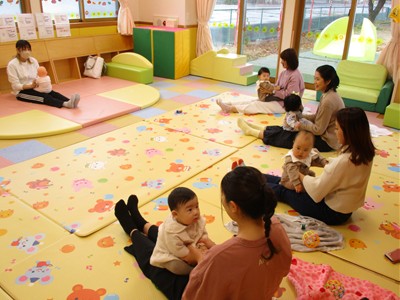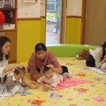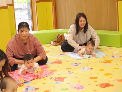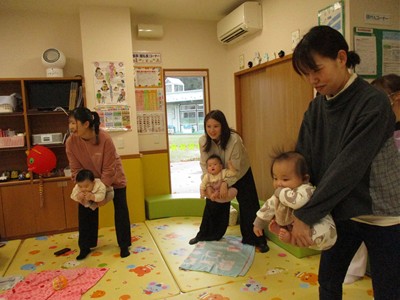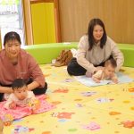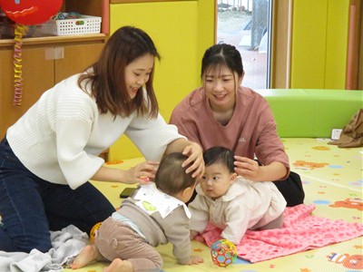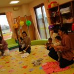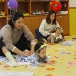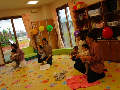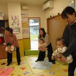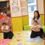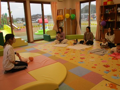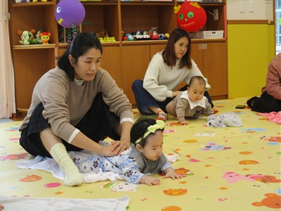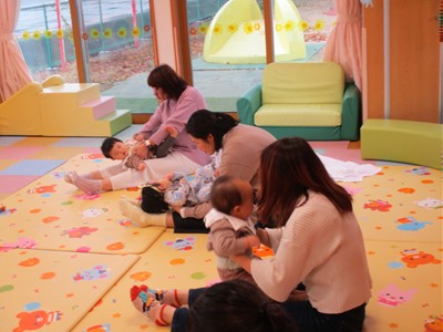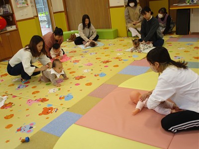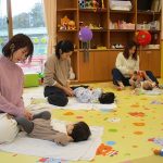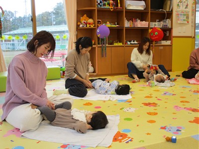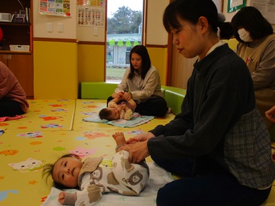 11月10日(月)育児講座「ベビーヨガ」を開催しました。今年度4回目の今日は、生後5ヶ月~11ヶ月の親子が参加。我が子を膝の上にのせて童謡を歌いながら、ママの骨盤体操や赤ちゃんへのマッサージ。「♪ハトポッポ♪の歌は、遅くも速くもなくでマッサージのテンポに丁度いいんですよ」と田島加奈絵先生。(ボディセンス・インティテュート公認インストラクター)頭のてっぺんから背中へ行き、足から足の指先を一つ一つ丁寧にマッサージをした後は、お腹から胸の方へ。ママの優しくてあたたかな手の温もりを感じながらのマッサージを、気に入った遊具を手に持ちまったりとした表情で受ける子ども達。そんな我が子の顔をのぞき込むようにして、歌ったりマッサージしたりするママのなんとも言えないやさしい表情は見ている方もつい顔がほころんでしまいそうでした。