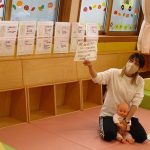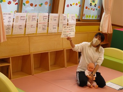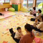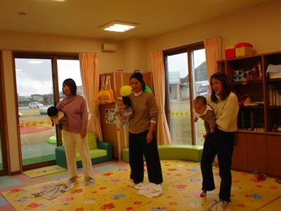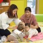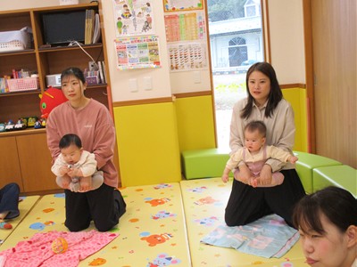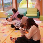 体を包み込むように丸くしての抱っこの形は、子ども達は本当にまったり満足そうでしたが、抱っこするママ達はだんだんしんどそうな表情に…。“まんまる抱っこ”は子どもが嬉しい遊びにもつながるようで、ここは“パパの出番”です。おうちでは、ママのマッサージとパパのまんまる抱っこで、みんなが心温まる時間を過ごしてもらえたらなと思いました。