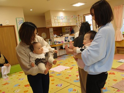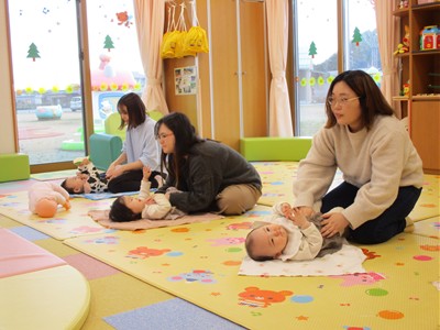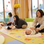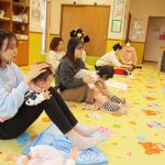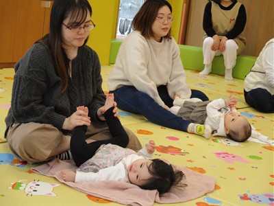 我が子を膝に乗せながらゆっくり動くママのための骨盤体操、ママの顔が近づいたり離れたりしながら体の真ん中で手や足を合わせる体操などを童謡を歌う優しい声の中、時間が流れていきました。ママと赤ちゃんのコミュニケーションの一つである“スキンシップ”。体の色んな所をマッサージすることはママと赤ちゃんとの信頼関係をつなぐばかりでなく、便秘解消や帽子ギライ、心の安定にもつながることを改めて感じました。バスタオルの上でマッサージの他、気持ちが落ち着く“まんまる抱っこ”や消防士さんのように片手で抱える“ファイヤーマン・ホールディング”等を体験し、最後はお胸の上にハートを描くように優しくマッサージ。