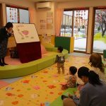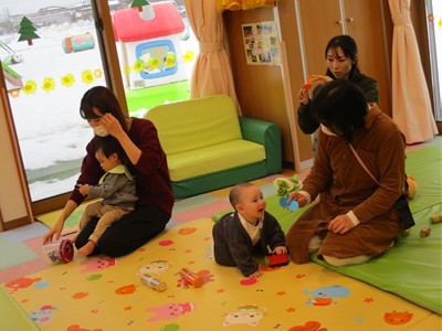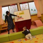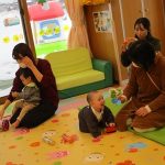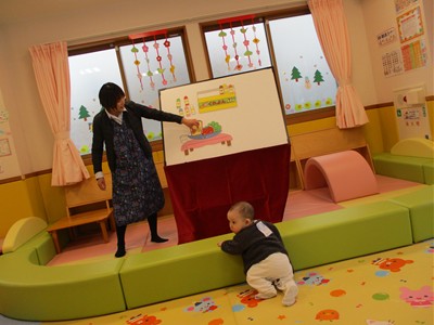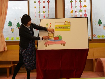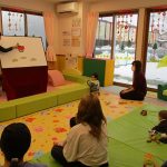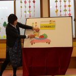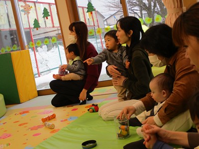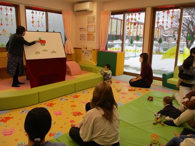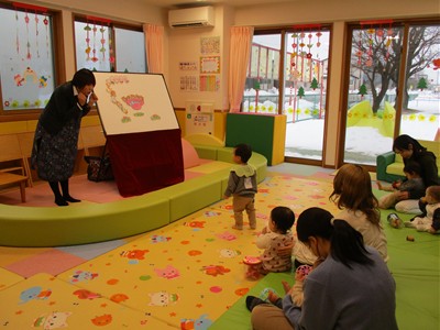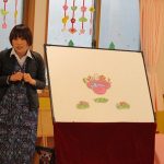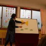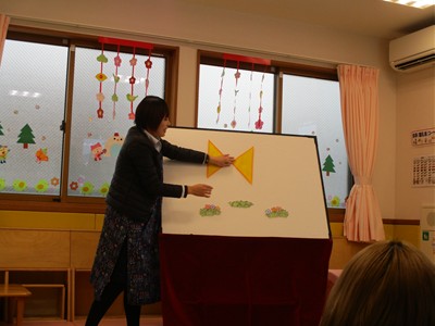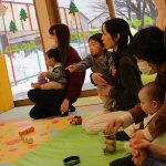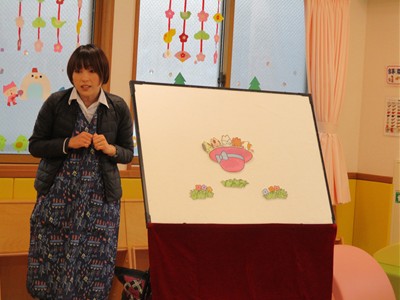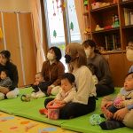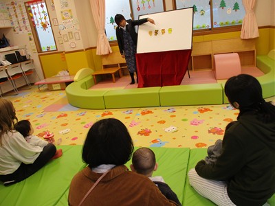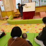 2月6日(金)親子サークル「パネルシアター」を開催しました。子ども達の大好きな手遊び“こぶたぬきつねこ”から始まり“ぞうさんのぼうし”と可愛い動物がたくさん出てくるパネルシアターに、始めはママの膝の上にチョコンと見ていた子ども達も色々な動物たちと可愛い大菅先生の歌声に誘われて前へ前へと…。形遊びからちょうちょの形の用紙を指にはめて、子ども達の頭やほっぺ、足元にふんわり止まった触れ合いの時間。可愛い歌声で“おはようクレヨン”や透き通る声でアカペラで歌の紹介。そんな大菅先生の歌声に、心地よい 春の訪れを感じたひとときでした。