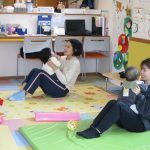 肩や背中、足、骨盤など体全体のストレッチから始まった産後ケア体操。徐々にテンポも上がっていき、軽快な曲に合わせて前後左右のハードな動きに。大家先生のこまかなアドバイスを受けながら、必死に体を動かすママ達の姿が印象的でした。