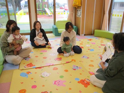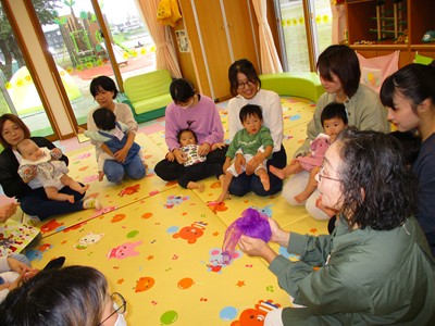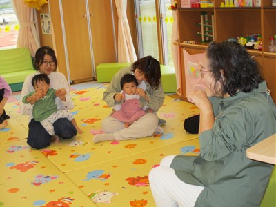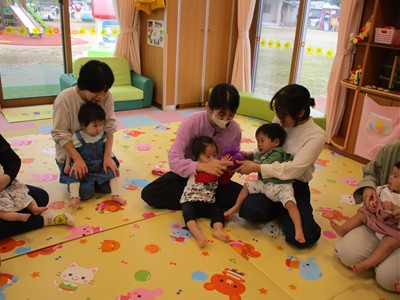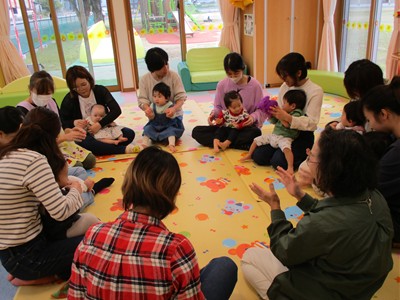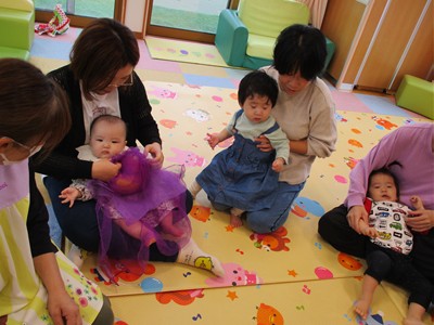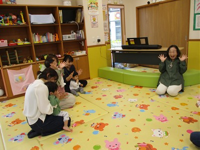 10月21日(火)塩原祐子先生による、親子サークル「リトミック」を開催しました。生後4ヶ月から1歳6ヶ月の子ども達とママ、9組が参加。いろんな動物が飛び出す歌にバージョンアップされた“こぶたぬきつねこ”の手遊びで、子ども達もママ達も祐子先生ワールドにどんどん引き込まれていきました。