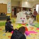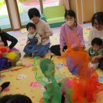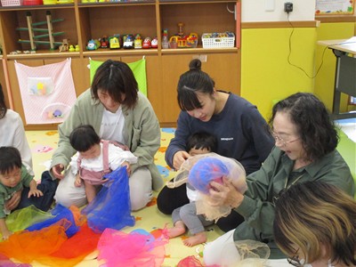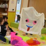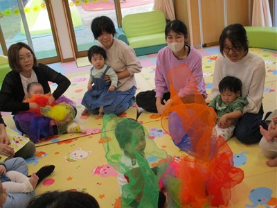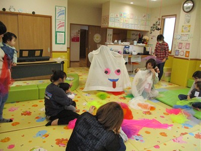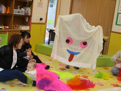 柔らかなオーガンジーの布をギュッとまとめて作ったボールを♪プレゼント♪の言葉と一緒におとなりさんへ廻していき、先生のストップの合図の時に持っていた子どもの目の前でオーガンジーボールをグニュグニュとほぐしていくと、カラフルな色合いのオーガンジーの布がモコモコ…!子どもも大人も思わず「うわ~!」と小さなどよめきが…。たくさん手に取り、上へポーンとしたり細長くたたんで結んで“トンボ”に見立てて子ども達の頭や顔にチョンと止まったり…。また、ハロウィンにちなんで大きなカーテンおばけも登場。いろんな素材の布で遊びました。最後は親子でリズミカルにリトミックあそび。ママに抱っこされながらママのホップ・ステップ・ジャンプのリズムを一緒に感じる子ども達はとっても楽しそうでした。