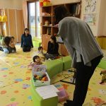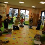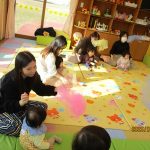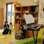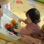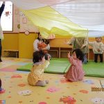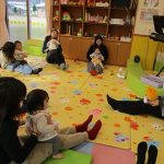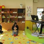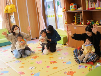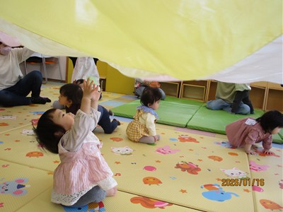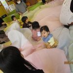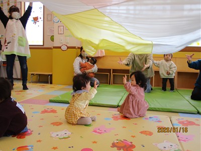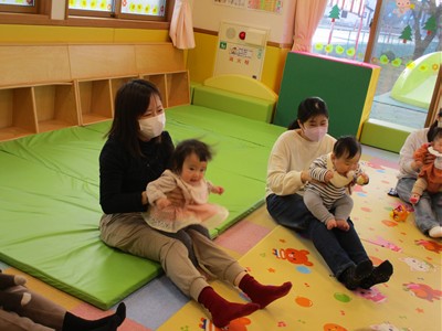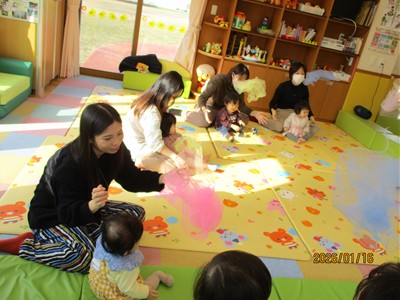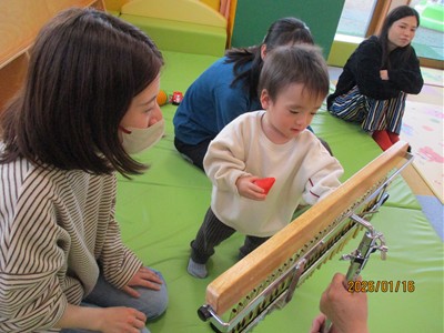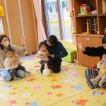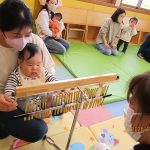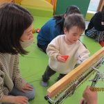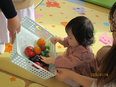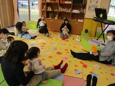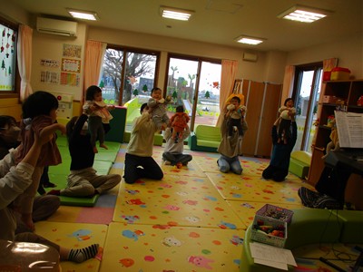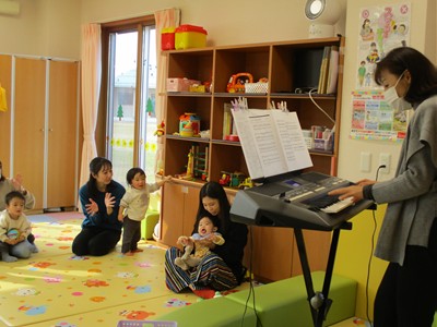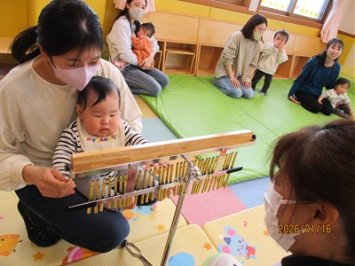 1月16日(金)あたたかな日ざしが差し込む陽だまりの中、緒方薫先生(富山県音楽療法協会)による「音楽リズム」を開催しました。生後5ヶ月から1歳5ヶ月の子ども達とママが参加。よちよち歩きとハイハイが盛んな小さな子ども達でしたが、緒方先生の軽快で元気なリズムを奏でるピアノの音色に誘われて、野菜の形のマラカスやスズを選び手に持ったりオーガンジー布を持ったりしながら、心で“音楽”を体で“リズム”を楽しむ姿が見られました。