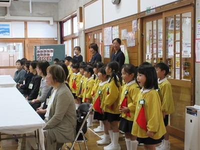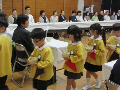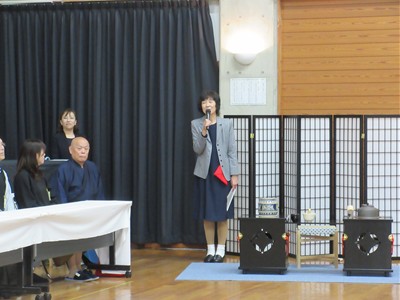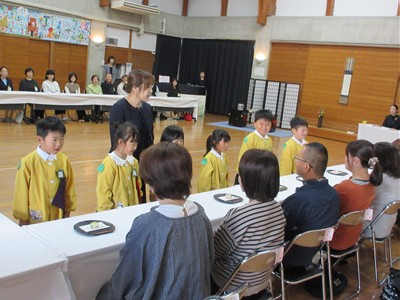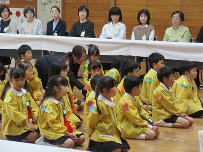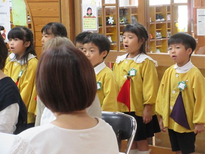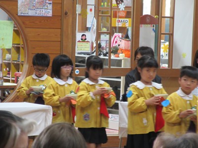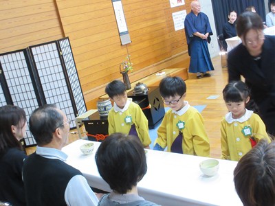 10月24日(金)に祖父母、地域の方々をご招待してお茶会を行いました。手作りの名札に来られる方の顔や絵を描く時から「おばあちゃん、きてくれる~」「大好きだからハート、描く♡」と楽しみにしていました。お茶会に向けて活動中も優しい気持ちを大切に頑張りました。今日のお茶会では、緊張した表情の中、お運びや言葉、お茶碗を回す作法など丁寧に行って心を込めておもてなしをしました。「ありがとう」と言われてホッとして笑顔になり和やかな雰囲気となりました。