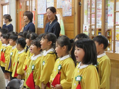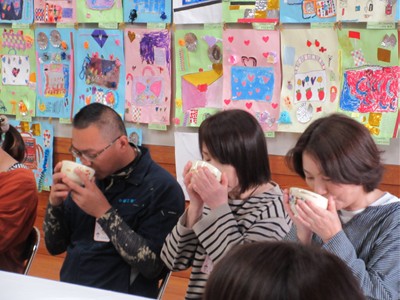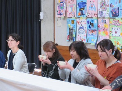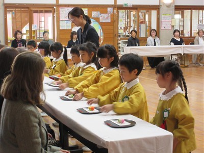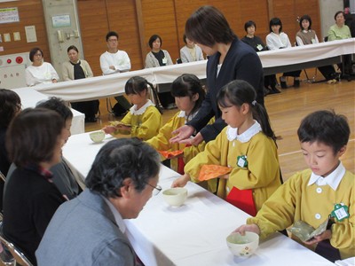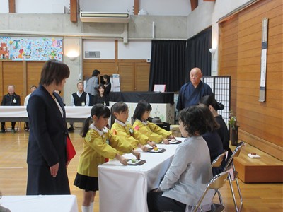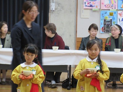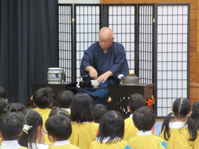 午後からは、子ども達もみんなでお菓子とお茶をいただきました。和菓子が好きな園児の多く「あんこ入っとる~」「甘くて、おいしい!」「いい匂いする~」「お茶、おいしい!」と味わいました。