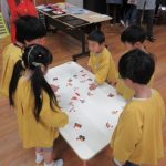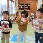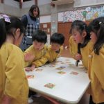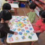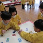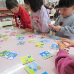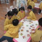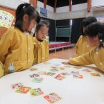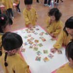 絵札の絵や文字を見ながら読み手になったり取り手になったりして、友達と一緒に楽しんできました。繰り返し遊ぶうちに「もっとたくさん取れるようになりたい!」と、お家でもかるた取りの練習をしていたようです。