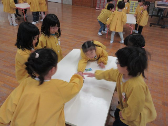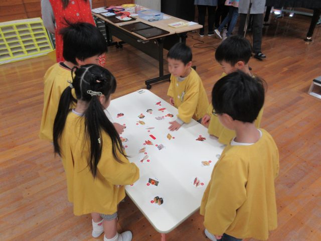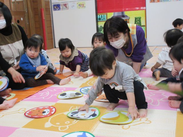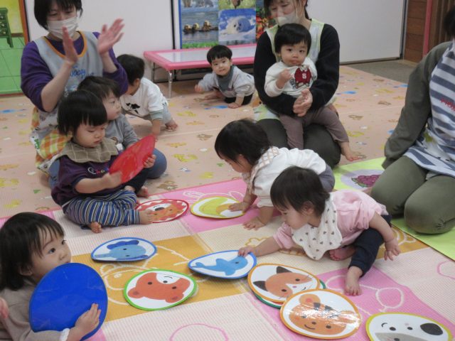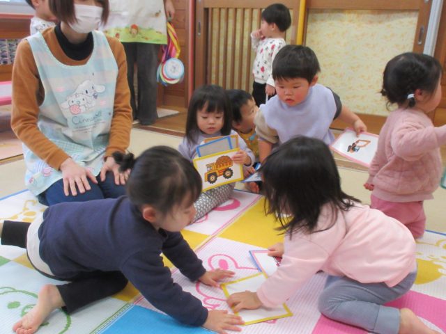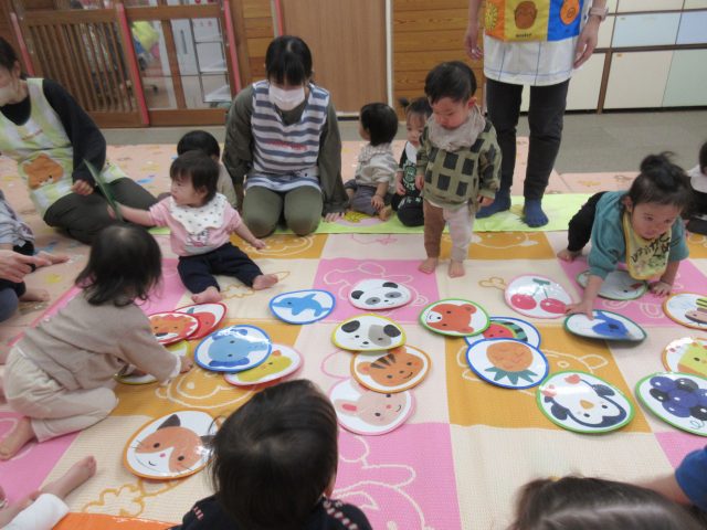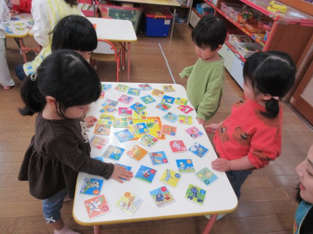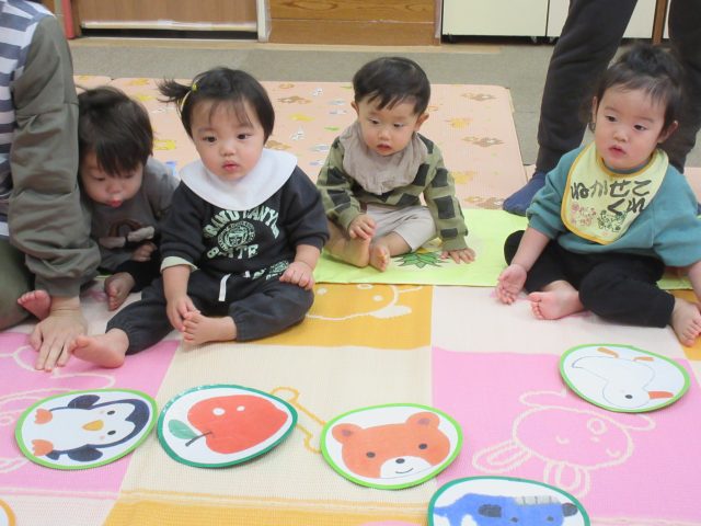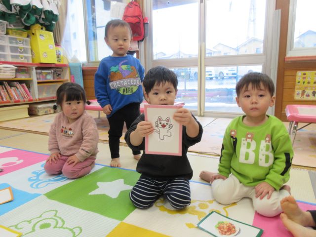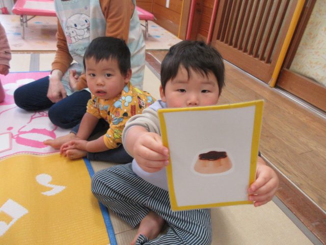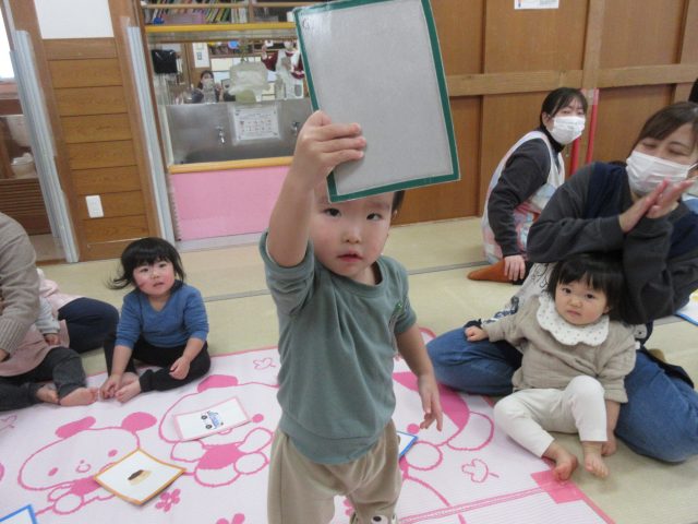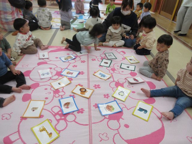 先生と一緒に絵カードを取ったり、知っている絵を見ながら「ハイッ!」と自分で取ったり、「みて~♡」と取れた絵カードを嬉しそうに見せてくれる可愛らしい姿が見られました。