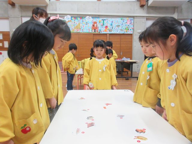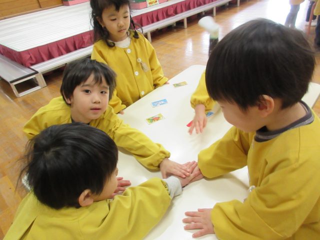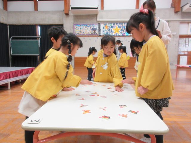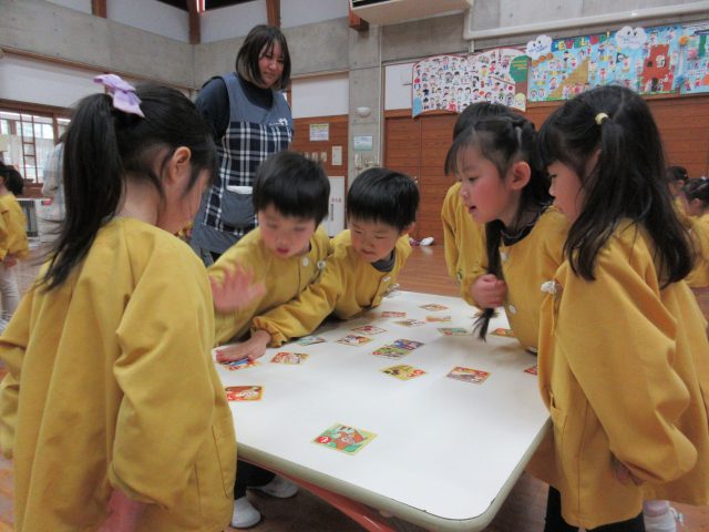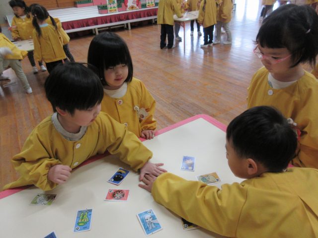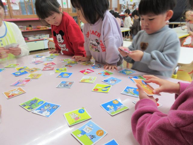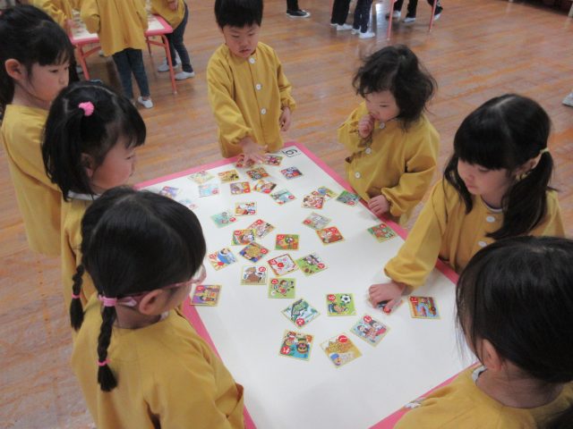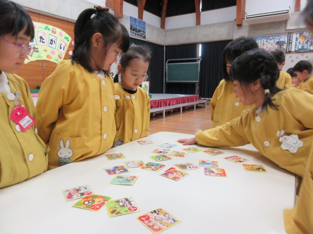 絵札の絵や文字を見ながら読み手になったり取り手になったりして、友達と一緒に楽しんできました。繰り返し遊ぶうちに「もっとたくさん取れるようになりたい!」と、お家でもかるた取りの練習をしていたようです。
