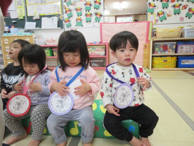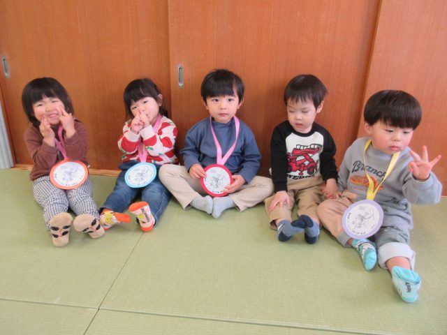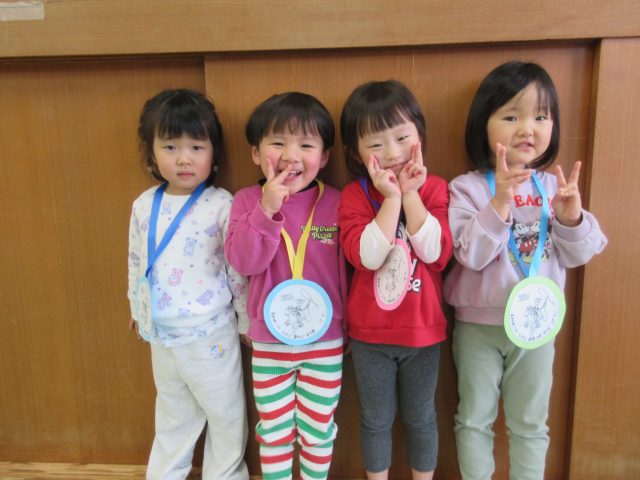 先生からメダルをもらって、みんなニッコリ笑顔!よく頑張りましたね。どのお友達も誇らしげでしたよ。