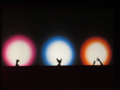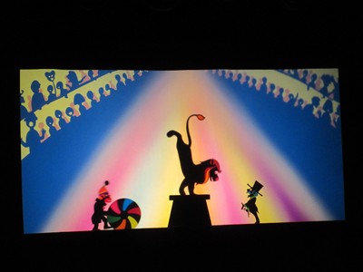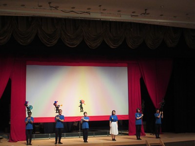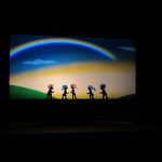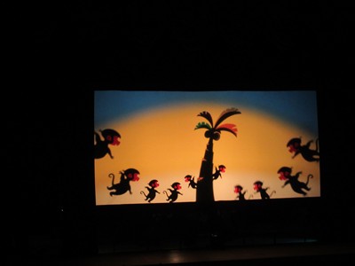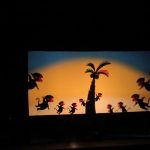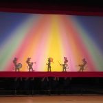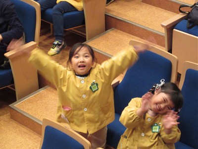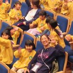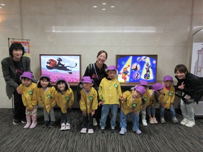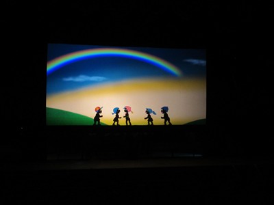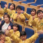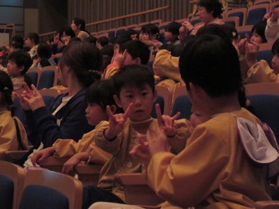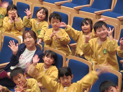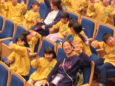 ”やさしいライオン“の話が始まると、ものがたりの世界に入り込んでいました。影絵の面白さ、不思議さ、幻想的な世界を味わいました。最後は、クックちゃんのお散歩♪曲に合わせて手拍子をしたり、知っている音楽が流れると一緒に歌ったり手遊びをして楽しみました。幕が下りた後は、幕いっぱいの大きな虹の映像が始まり「すごーい!」「ブラボ~☆」と歓声が上がりました。