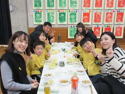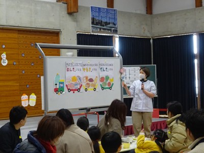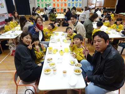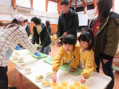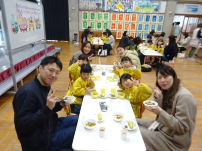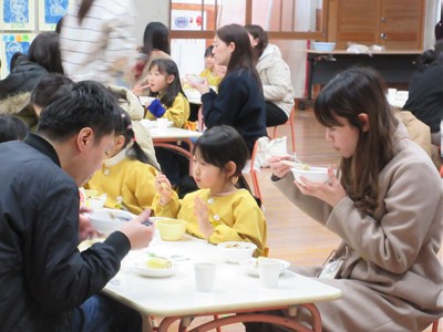 給食参観では、原田栄養士の食育の話・クイズを楽しみ、美味しい給食をいただきました。お父さんお母さんと一緒に食べることができ、食欲が増し会話も弾み、プレイルームいっぱいに広がっていました。