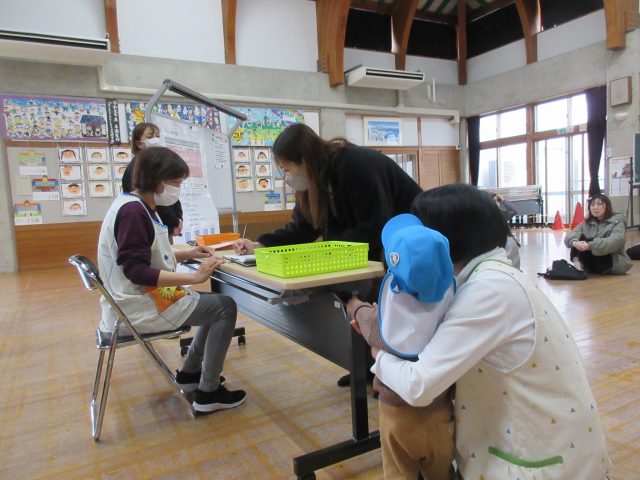 保育参加では、災害時に備えて、初めて避難訓練での引き渡しに参加していただきました。お父さんやお母さんの顔を見つけて涙を流す姿もありましたが、引き渡しの順番が来るまで保育教諭等と待って、無事に保護者の方々に引き渡し、保護者の方と一緒に引き渡しの手順を確認することができました。