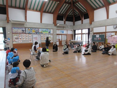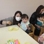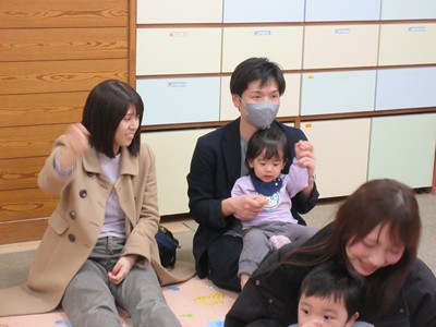 おやつ後は、お部屋に戻って帰りのお集りをしました。「お返事はーい!」をしたり、大好きな手遊びやペープサートを見たり、親子でふれあい遊び、ふれあいマッサージを楽しみました。いつもと違う雰囲気にドキドキし、お家の方から離れない姿もありましたが、どの子も嬉しそうに参加していました。