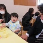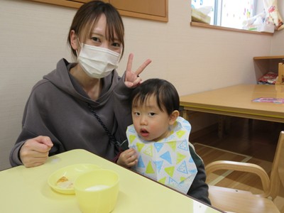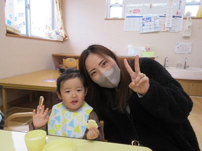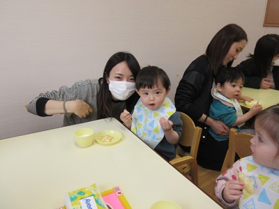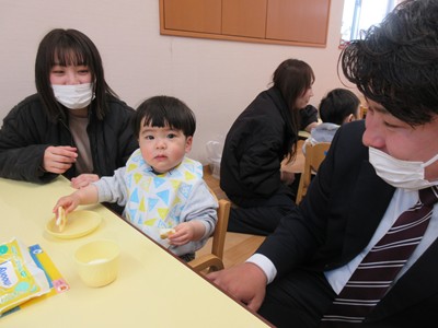 その後は、お父さん・お母さんと一緒にランチルームは移動。大好きなおやつの時間です。いつもは椅子に座って食べていますが、ママのお膝に座って食べたいお友達や、食べさせてもらいたいお友達など様々な姿が見られました。お家の方に見守られながら、おいしくおやつを食べ、牛乳をおかわりして飲む姿もありました。