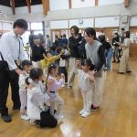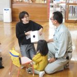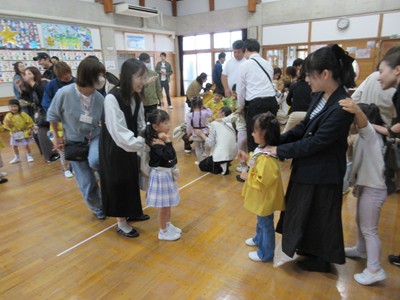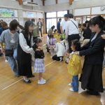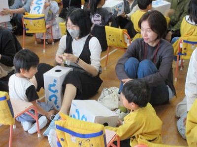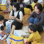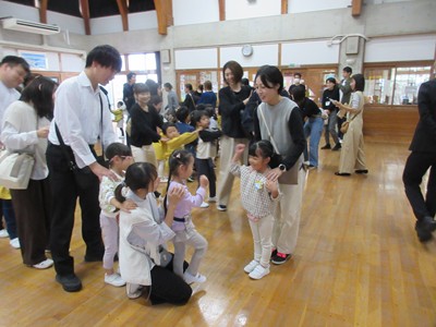 親子ゲームでは、”じゃんけん列車”をしました。大好きなおうちの方と列車になって、ゲームをできたことがとても嬉しかったようで、ニコニコなみんな。「かもーつれっしゃ! しゅっしゅっしゅ~」と、かわいい声がたくさん聞こえてきました。