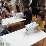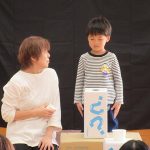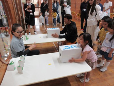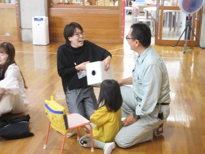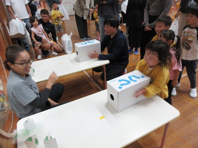 科学遊びでは、学研教育みらいより講師の先生に来ていただき、”空気砲”を用いて空気の不思議を学びました。コップを高く飛ばすために、空気砲を叩く位置や、コップの置き方を、親子で研究する姿がたくさん見られました。