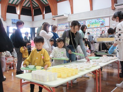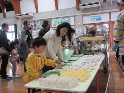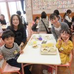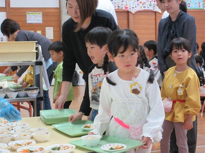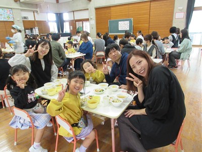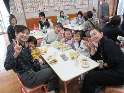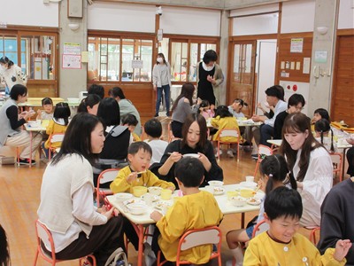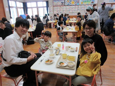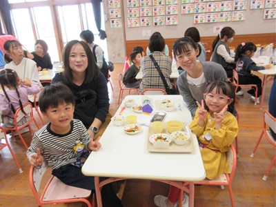 給食参観では、おうちの方と配膳をしたり、給食を食べたりしました。その嬉しさからか食欲も増して、いつもよりもたくさんおかわりをしていました。