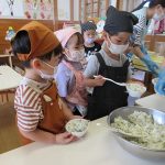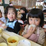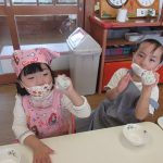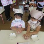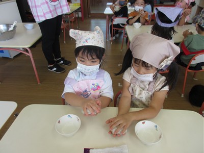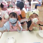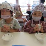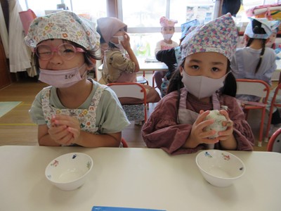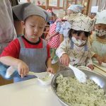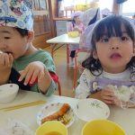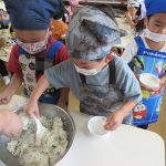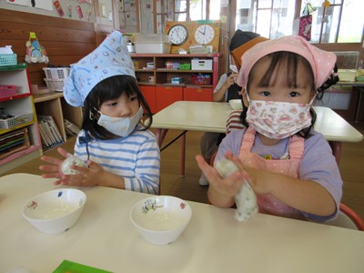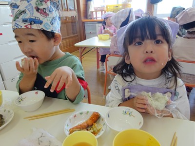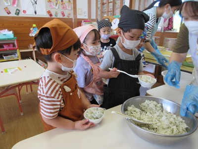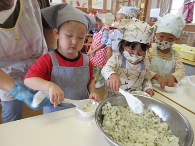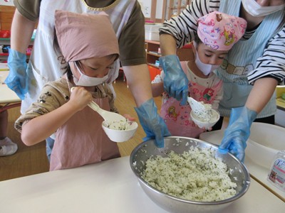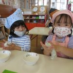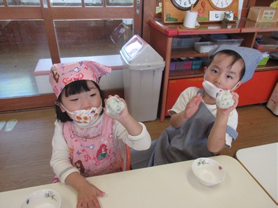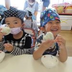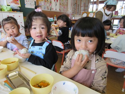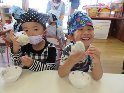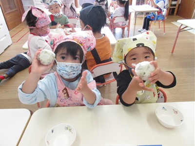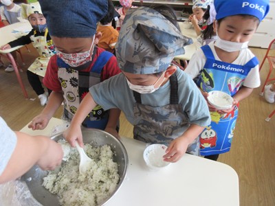 いよいよ初めてのクッキング。エプロン・三角巾・マスクを身に着けて、ドキドキ・ワクワクとても楽しみな様子‼手を洗って準備O.K!ラップが敷いてある茶碗に、自分で青菜ご飯をよそい、「おいしくな~れ♡ギュ・ギュ・ギュ‼」と、丸や三角、ハート等の形になるように一生懸命にぎっていました。友達と「ホラ!できたよ。」と、完成したおにぎりの見せ合いっこも楽しんでいました。「いただきます。」と、自分でにぎったおにぎりを、大きな口でパクリ!「おいし~い!」と、みんな大喜びでした。
