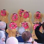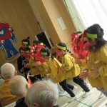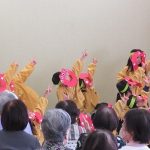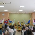 入場の曲には、おじいちゃんおばあちゃん達にも聞きなじみのある『世界の国からこんにちは』の曲を選びました。曲が流れてくるとおじいちゃんおばあちゃん達も笑顔で子ども達を出迎えて下さいました。みなさんが盛り上げて下さったおかげで、楽しんでダンスを披露することができました。一緒に踊ったり、手拍子をしていただいたり、万国旗を振っていただきました。その様子を見て子ども達も俄然やる気になり、全身を使って踊っていました。ダンス2曲終わると「やり切ったぞ!!」というような満足気な表情でした。