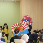 子ども達が作ったミャクミャクの折り紙のカードをプレゼントをすると、皆さんとても喜んでくださり、何度も「ありがとう」と、お礼を言ってくださいました。