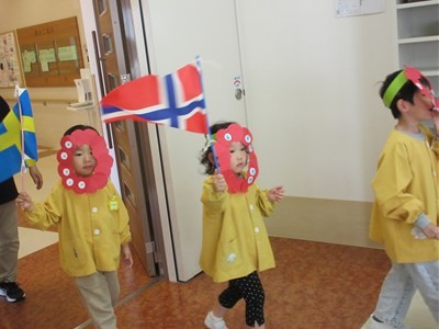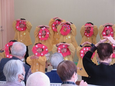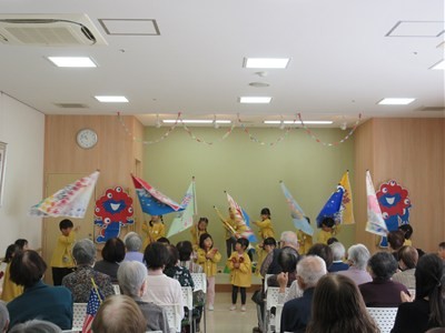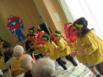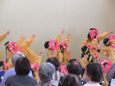入場の曲には、おじいちゃんおばあちゃん達にも聞きなじみのある『世界の国からこんにちは』の曲を選びました。曲が流れてくるとおじいちゃんおばあちゃん達も笑顔で子ども達を出迎えて下さいました。みなさんが盛り上げて下さったおかげで、楽しんでダンスを披露することができました。一緒に踊ったり、手拍子をしていただいたり、万国旗を振っていただきました。その様子を見て子ども達も俄然やる気になり、全身を使って踊っていました。ダンス2曲終わると「やり切ったぞ!!」というような満足気な表情でした。