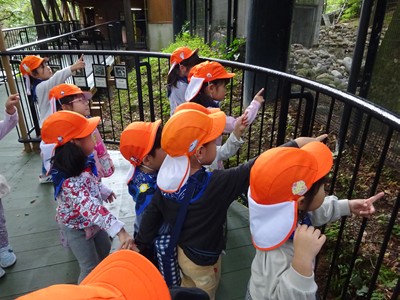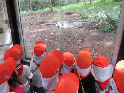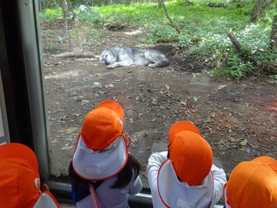 年中組は、「たくさんの動物を見たい!」というみんなからの声でコースを決め、パークをぐるっと一周しました。「さるの赤ちゃんおるよ!」「オオカミさんでっかいね~」とお友達や保育教諭と動物の話をする様子がたくさん見られました。