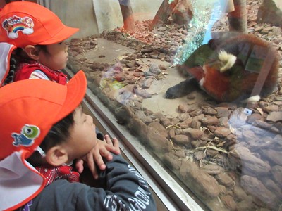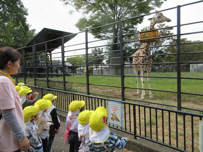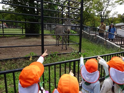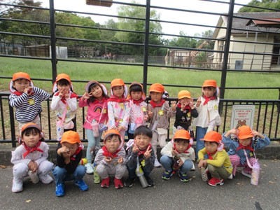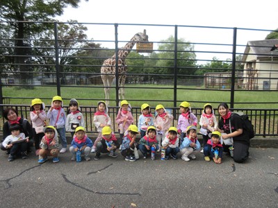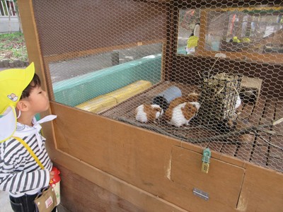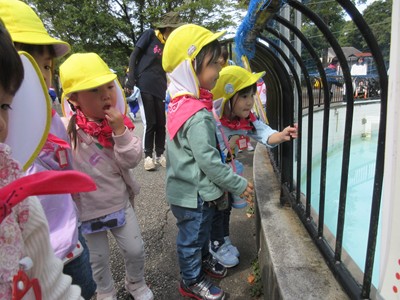 年少組は、子どもたちだけで行く初めての遠足でしたが、リュックと水筒を持って頑張って歩きました。いろんな動物を見た中でも、モルモットやウサギなどのかわいい動物がお気に入りだったようで、メロメロになっていました。