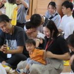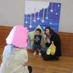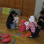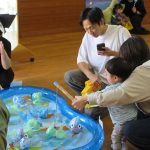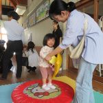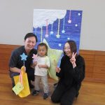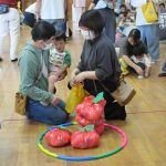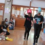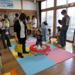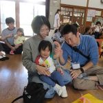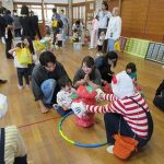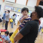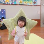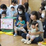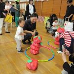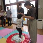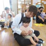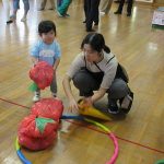 まずは手遊び!子ども達の大好きな「やさいのうた」や「ひっつきもっつき」の歌で、親子で踊ったり、おでこやおしり等をくっつけてふれあい遊びを楽しみました。
