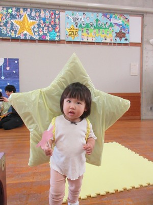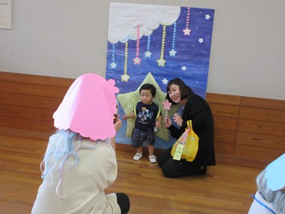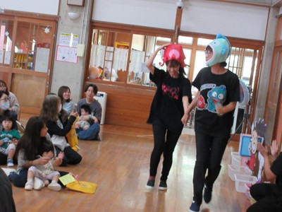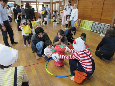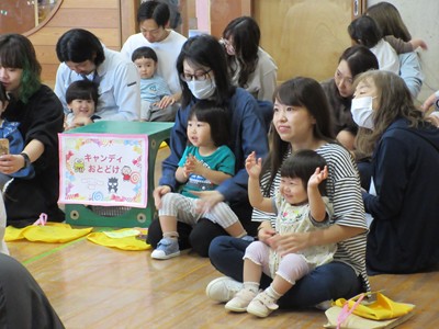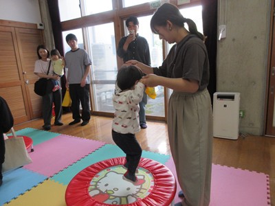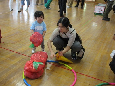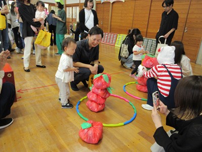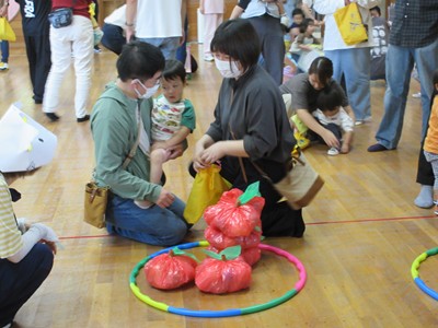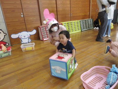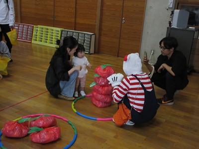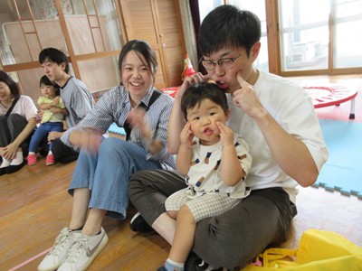 まずは手遊び!子ども達の大好きな「やさいのうた」や「ひっつきもっつき」の歌で、親子で踊ったり、おでこやおしり等をくっつけてふれあい遊びを楽しみました。