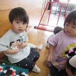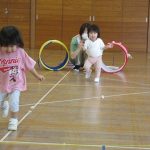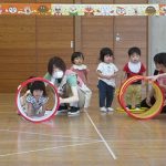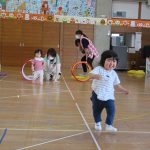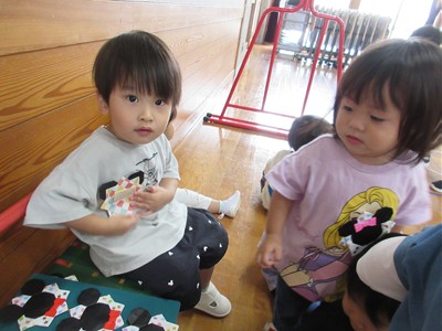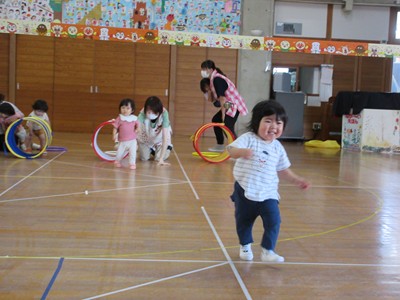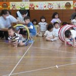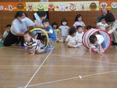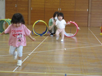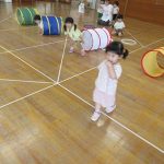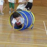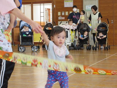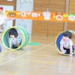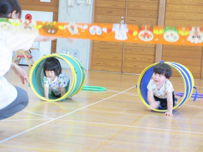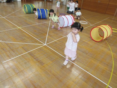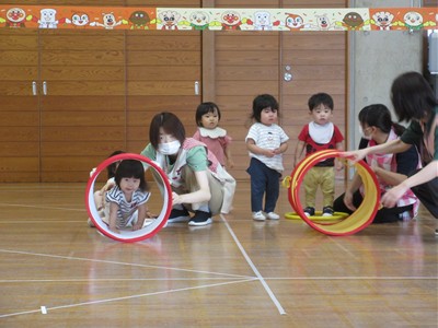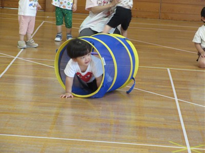 今日はトンネルをくぐり、アンパンマンのゴールテープを目指してかけっこをしました。