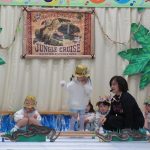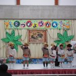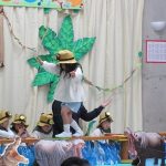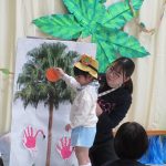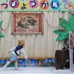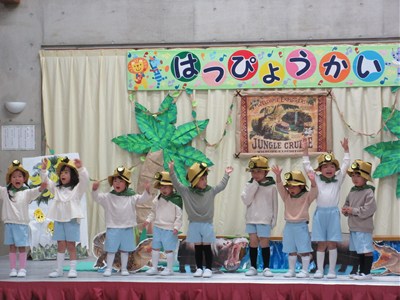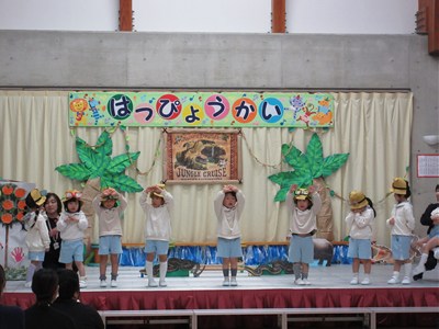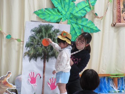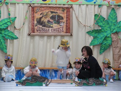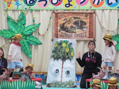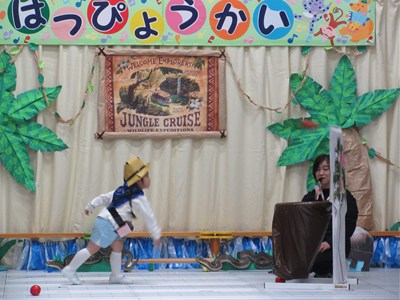 そんな子ども達の姿からジャングル探検をテーマにして、さまざまな動物の世界を探検しながら、果物をゲットするストーリーでの発表。